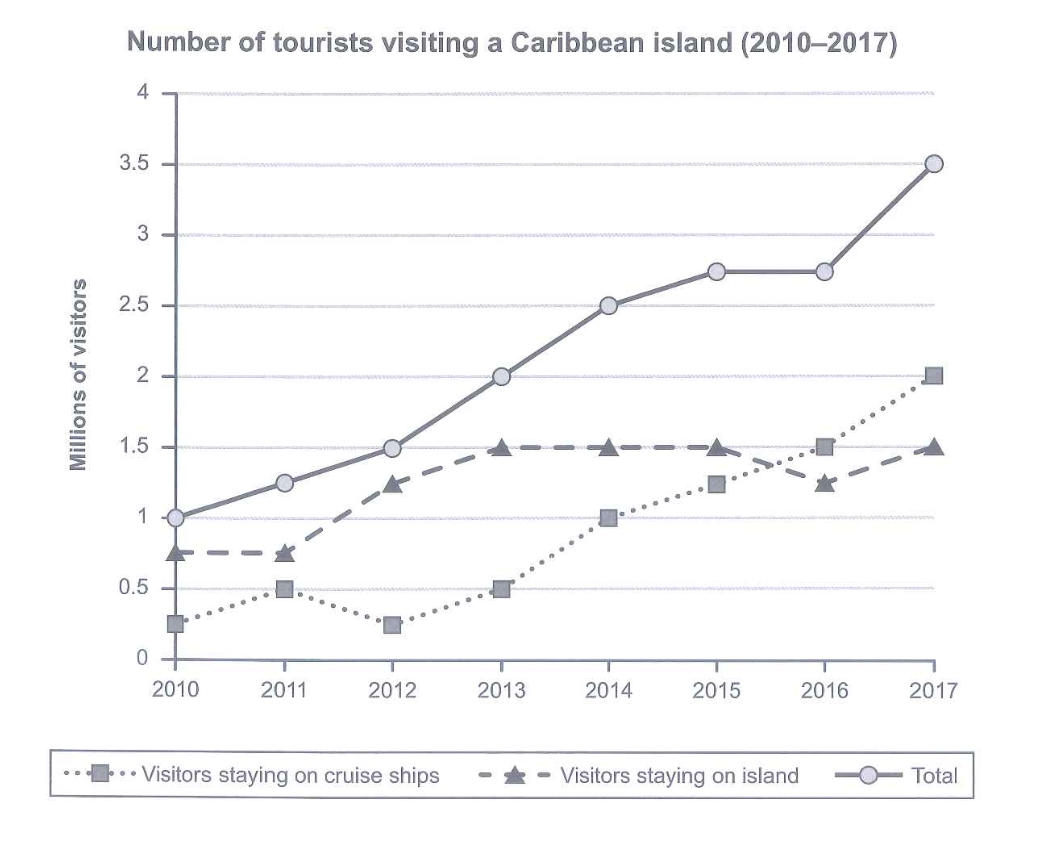 The graph below shows the number of tourists visiting a particular Caribbean island between 2010 and 2017. Summarize the information by selecting and reporting the main features, and make comparisons where relevant.