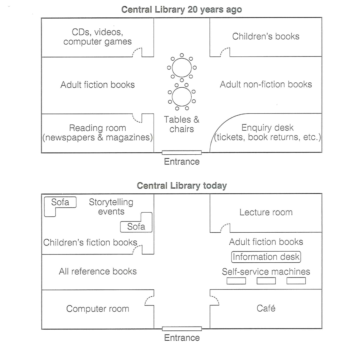 The diagram below shows the floor plan of a public library 20 ears ago and how it looks now. Summarize the information by selecting and reporting the main features, and make comparisons where relevant.