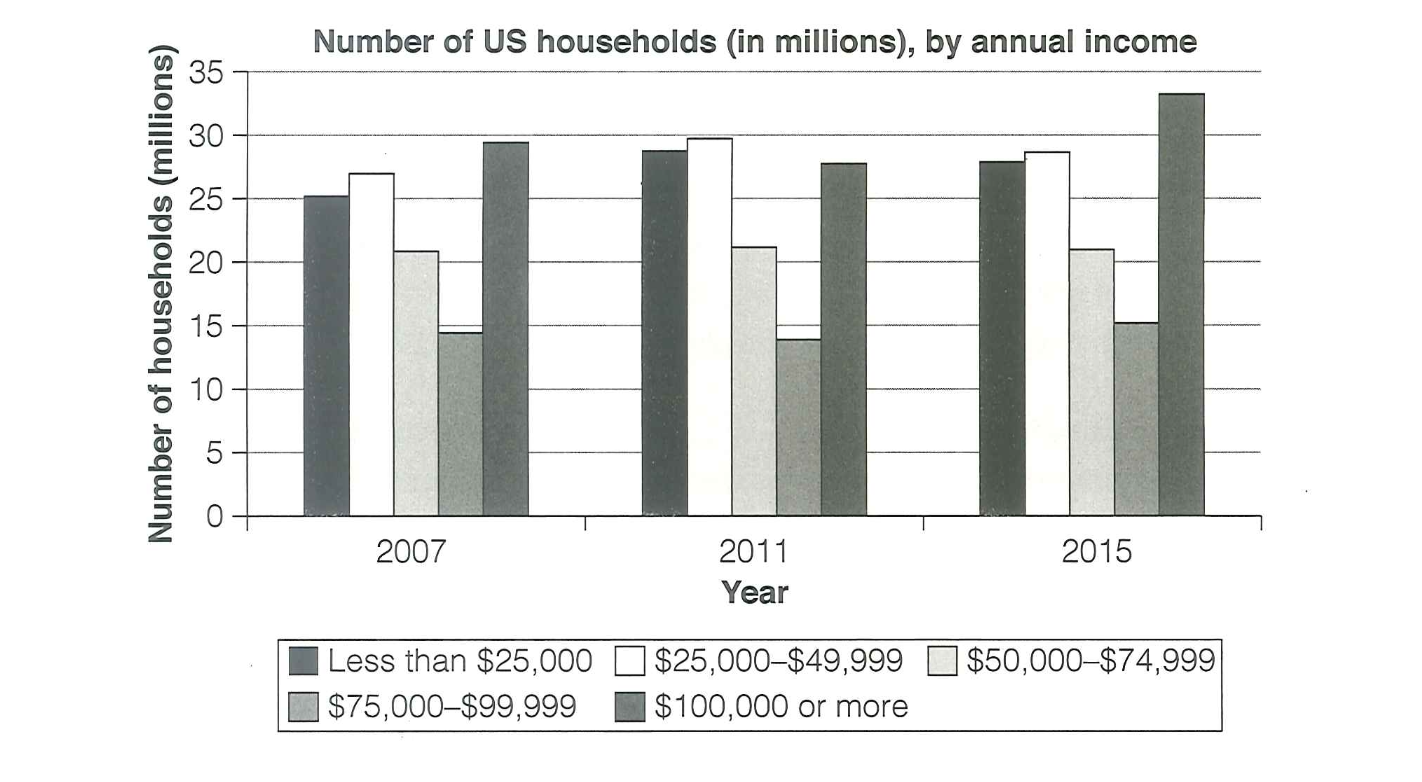 The chart below shows the number of households in the US by their annual income in 2007, 2011 and 2015. Summarize the information by selecting and reporting the main features, and make comparisons where relevant.