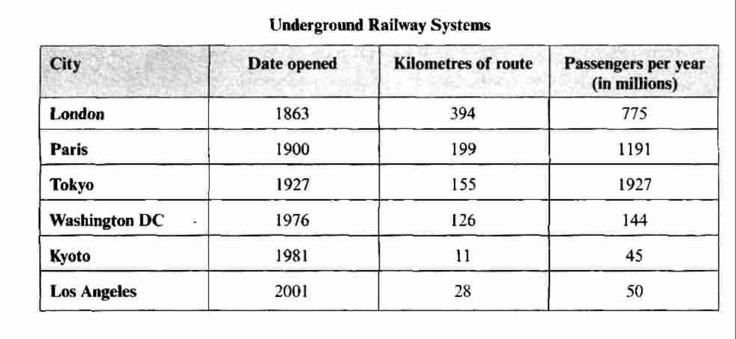 The table below gives information about the underground railway systems in six cities. Summarize the information by selecting and reporting the main features, and make comparisons where relevant.