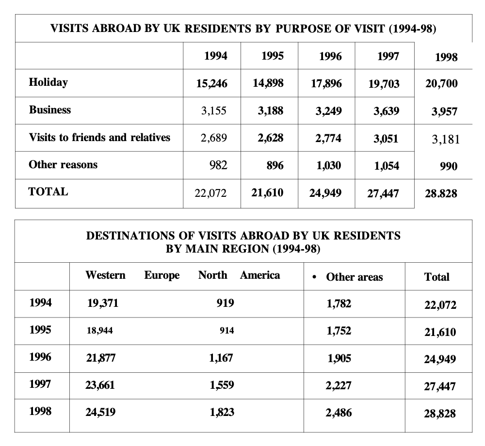 The first table gives us information on the number of overseas trip undertaken by UK inhabitants and their motivations from 1994 to 1998. The second one illustrates the geographical locations of the abroad trips in the same 5 years.