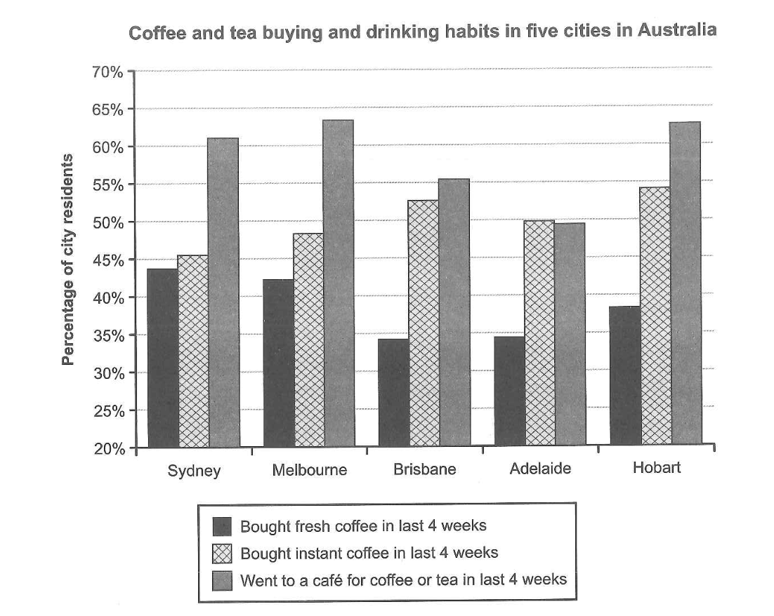 The chart below shows the result of a survey about people's coffee and tea buying and drinking habits in five Australian cities. Summarize the information by selecting and reporting the main features, and make comparisons where relevant.