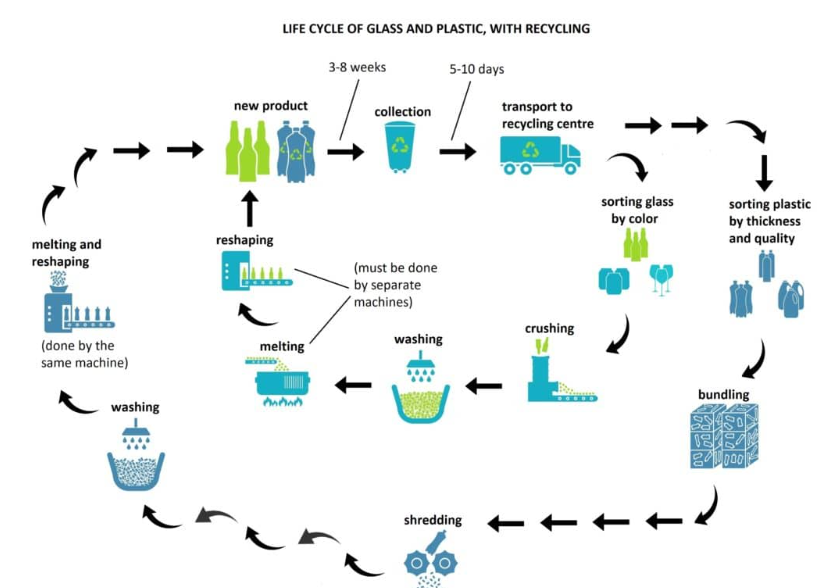 Three stages that plastic and glass recycling have in common are: the usage of new items by consumers, collection of discarded goods after 3 to 8 weeks, and transportation to a recycling center within 5 to 10 days after collection. Then, the two cycles branch.