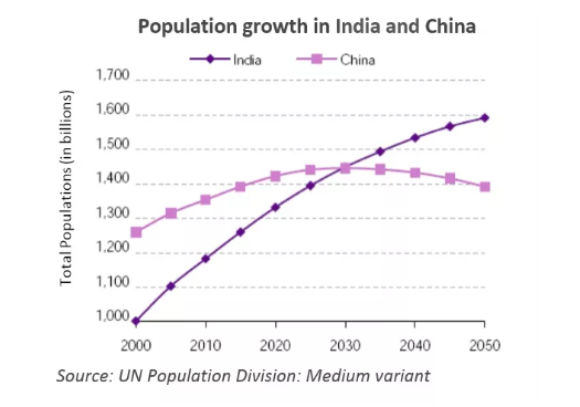 The graph below shows the population for India and China since the year 2000 and predicts population growth until 2050. Summarise the information by selecting and reporting the main features, and make comparisons where relevant. Write at least 150 words.
