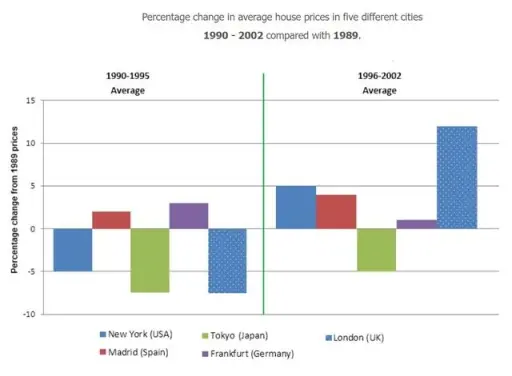 Even though the proportional change of house prices of the cities (except Frankfurt) increased between 1996 and 2002, Tokyo still had its costs less than that in 1989, with a percentage drop of 5%. London saw its house prices changed dramatically with its proportional change jump from -5% to way more than 10%. On the other hand, the accommodation prices in New York rose by 5% compared to those in 1989, whereas Madrid and Frankfurt still kept that no-more-than-5% increase streak. The difference is that Madrid had a larger rise than Frankfurt's.