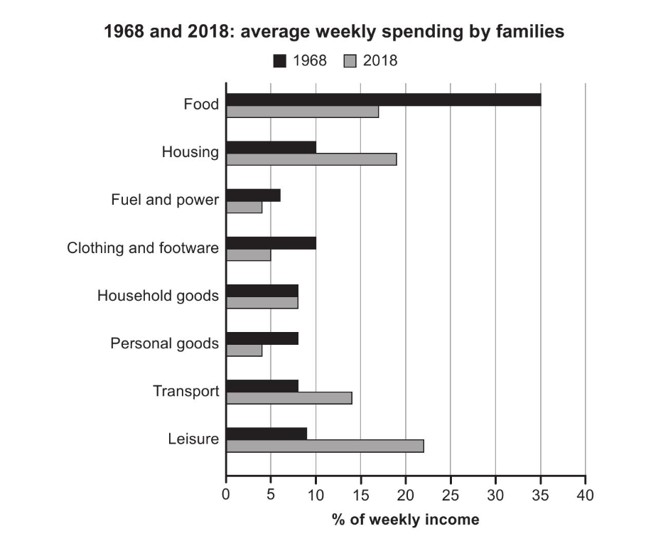 The chart below gives information about how families in one country spent their weekly income in 1968 and in 2018. Summarize the information by selecting and reporting the main features, and make comparisons where relevant.